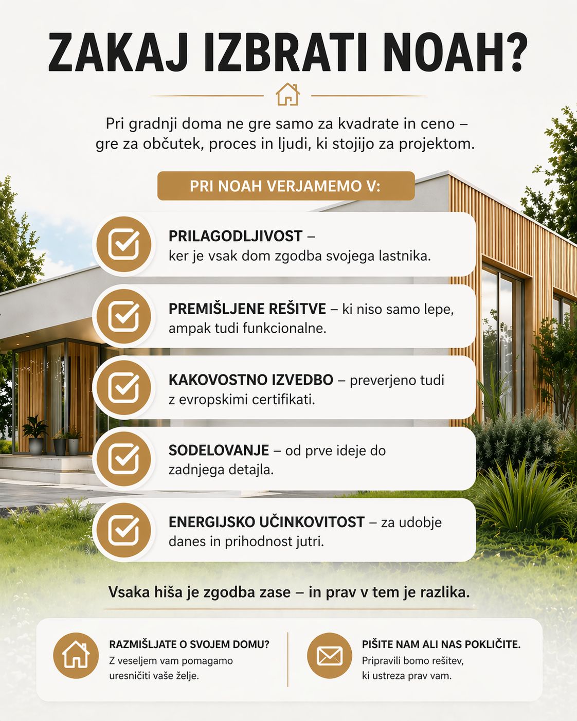 Pri NOAH ob tem poudarjajo, da načrtovanje z njihovimi arhitekti prinese zelo konkretne prednosti, saj omogoča boljše usklajevanje želja s končno ceno, bolj premišljeno umeščanje hiše na parcelo in pravočasno vključevanje vseh tistih detajlov, ki jih ljudje v začetni fazi morda še ne vidijo kot odločilne, pozneje pa pogosto pomenijo veliko razliko. Prav tu se pogosto pokaže, kako pomembno je, da so stvari domišljene dovolj zgodaj, saj je poznejših popravkov, nepredvidenih rešitev in s tem tudi nepotrebnih stroškov bistveno manj.