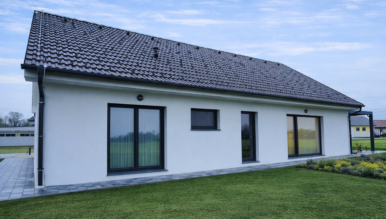 Hiša je zgrajena s steno Optimum, z dvokapnim paličnim ostrešjem in natančno oblikovanimi napušči – 30 centimetrov na čelnih in 60 centimetrov na kapnih straneh, ki so zaključeni s fasado in objektu dajejo mehak, zaključen rob. Vgrajena so Remoplast okna in vrata, ki v notranjost spuščajo veliko naravne svetlobe, senčenje pa je rešeno z električnimi roletami, kar pomeni, da se hiša na ritem dneva odziva skoraj neopazno. Komarniki in izvlečne podstrešne stopnice so tisti detajli, ki jih opaziš šele, ko jih potrebuješ in ki se takrat izkažejo za nepogrešljive.