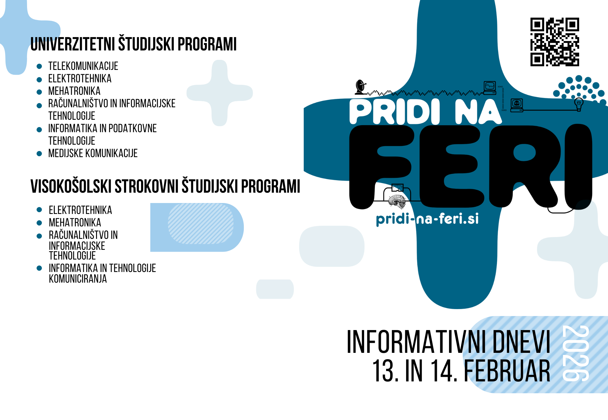 Ti bodo potekali v petek, 13. februarja, in soboto, 14. februarja, v dopoldanskih in popoldanskih terminih. Obiskovalce čaka skupna predstavitev fakultete, nato pa tudi predstavitve posameznih študijskih programov po predavalnicah ter neformalni pogovori s študenti na informacijskih otokih ob kavi. Informativni dnevi ponujajo priložnost za iskren vpogled v študij, vsakdan na fakulteti in konkretne možnosti, ki jih FERI odpira že med študijem.