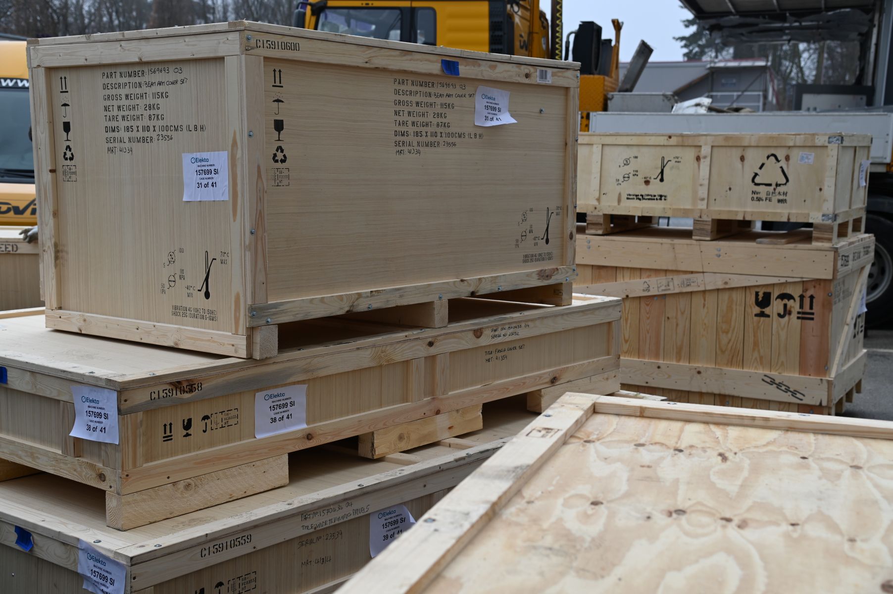 V Univerzitetni klinični center (UKC) Maribor so danes dostavili prvega od skupno štirih obljubljenih novih obsevalnikov za oddelek za onkologijo, ki bodo nadomestili stara, ki se nenehno kvarita. "S tem ne bo več voženj v Ljubljano, zdravljenje bo še bolj kvalitetno in prijazno," je zadovoljna v.d. predstojnice oddelka Tamara Petrun.