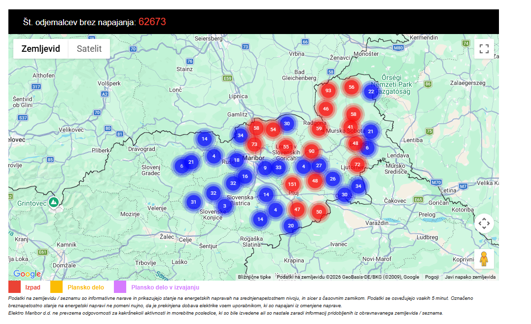 Zahtevne vremenske razmere tudi v popoldnevu povzročajo obsežnejše motnje ter izpade v oskrbi z električno energijo na širšem območju Elektra Maribor. Okoli 13.50 je bilo brez napajanja več kot 60.000 odjemalcev.
